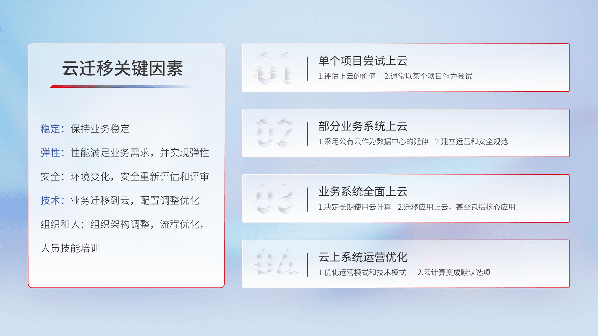 结合实际业务,,,,从规划设计、、云平台选型、、、云原生改造、、数据迁移、、、、集成交付,,,迁移全过程为客户识别最佳上云路径,,,做好风险识别管理,,,,设计网络架构、、、身份权限、、、、安全审计合规、、、操作审计、、日志审计、、、、监控告警策略、、、多站点容灾设计等,,,,对云上基础设施进行整体规划,,,提升IT治理水平,,,以满足弹性、、、、高可用、、、高性能的需求。。。