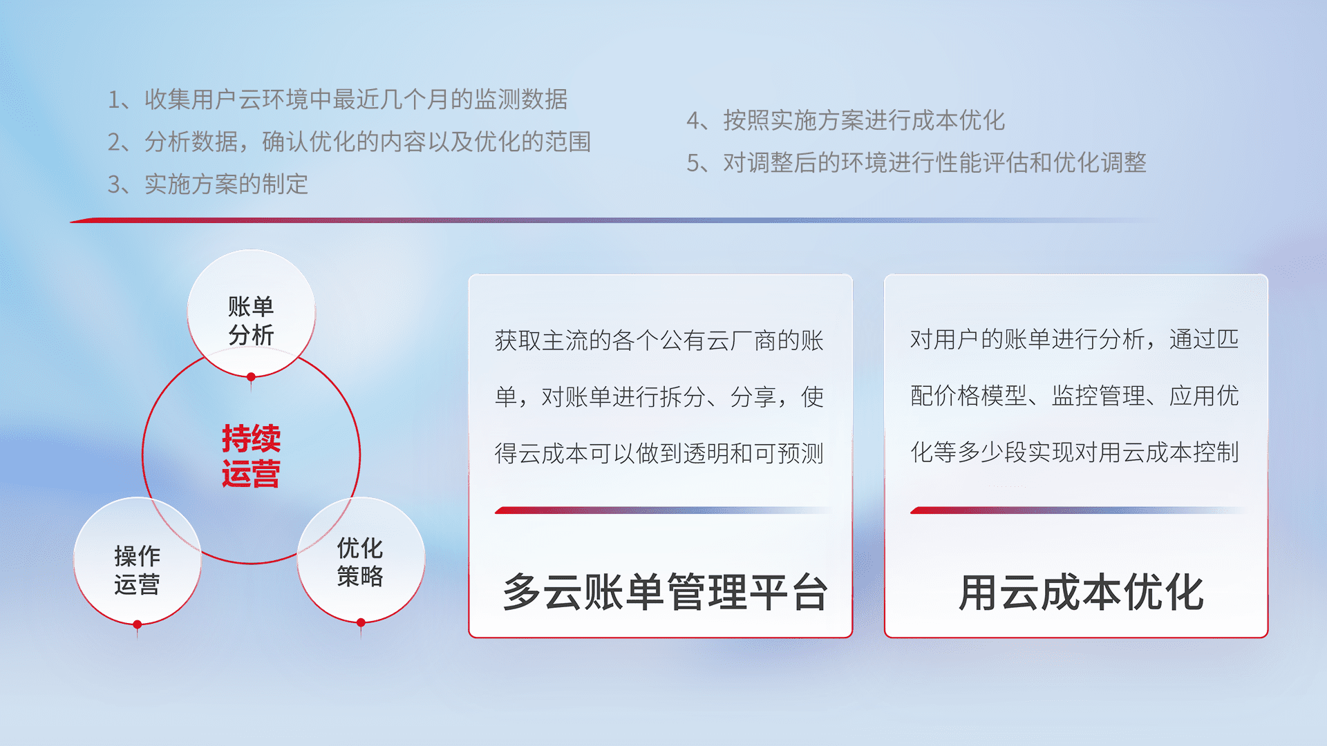 通过多云纳管,,以统一的资源数据模型把客户的云资源进行抽象和封装,,进而实现对多云资源的统一操作,,,,保障云资源管理的可靠性、、稳定性与可用性。。量身定制化运维内容,,,配置、、开发运维、、、、补丁管理、、、备份、、监控、、、认证和访问管理、、、审计和日常巡检等,,,,保障在用云过程中的可靠度,,稳定度以及高可用率。。。